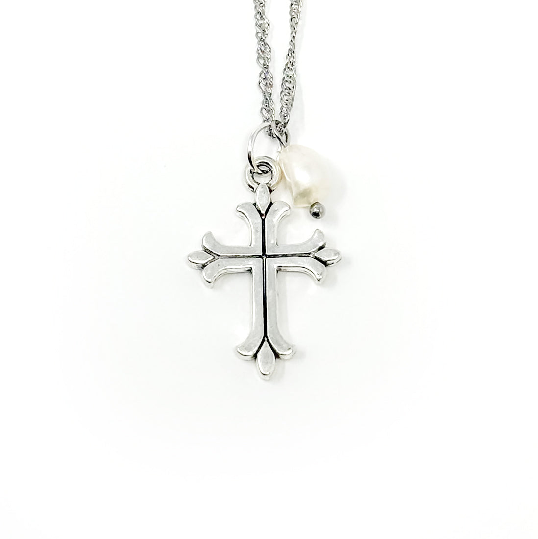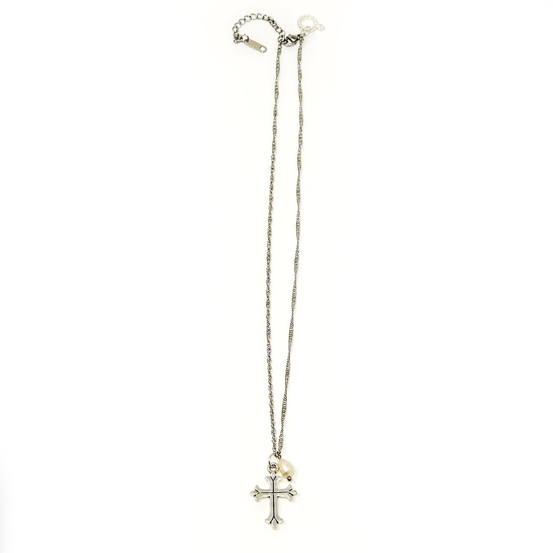 18" Silver Twisted Chain with Silver Cross & Pearl